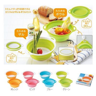 たたんですっきり収納できるカラフルなザル&ボウルのセット。